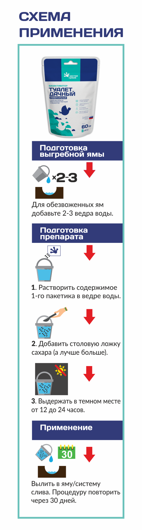 Содержимое одного пакета высыпать в ведро с водой , перемешать. Для усиленного эффекта добавить столовую ложку сахара и выдержать 12 часов. Далее залить в выгребную яму/систему слива туалета. Если содержание ямы обезвожено, предварительно добавить 2-3 ведра воды. Эффективность препарата выше во влажной среде. Повторить обработку через 3 недели.